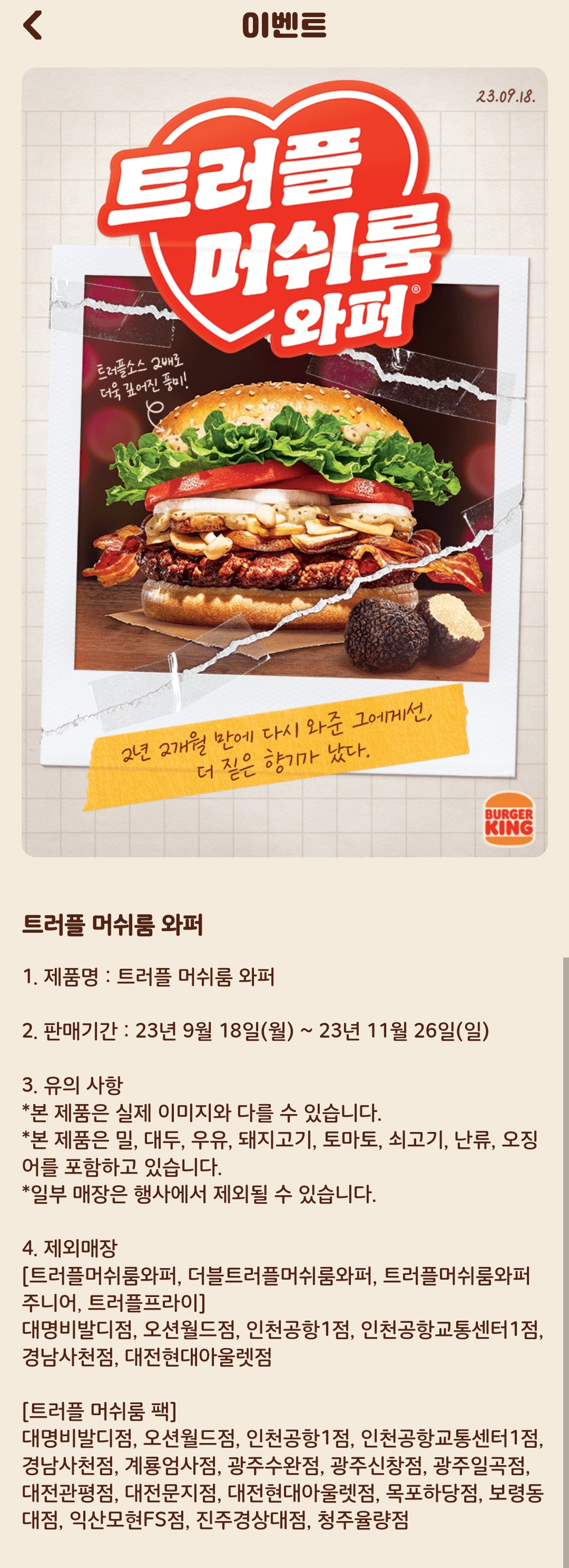 이번달 이벤트 버거는 트러플 머쉬룸 와퍼에요.