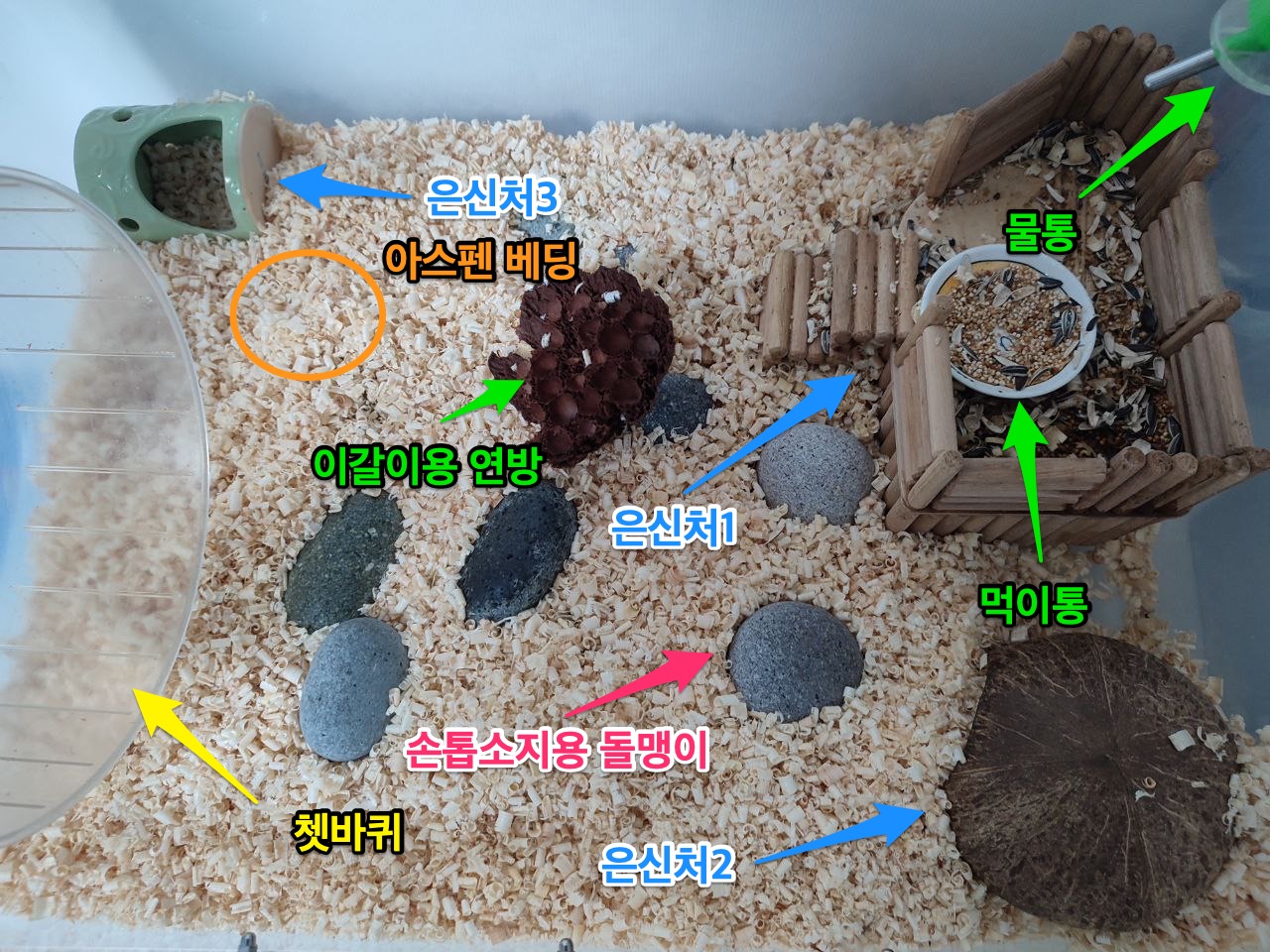 - 집 바닥은 아스펜 베딩을 뿌려주면 햄스터의 관절건강에도 좋고 굴파기도 맘껏할 수 있어서 좋습니다.